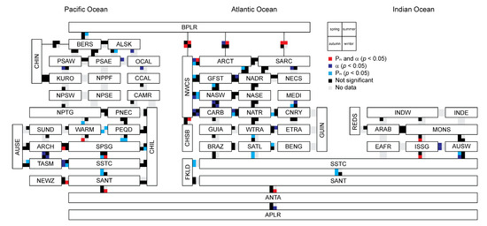 Relationships of photosynthesis versus irradiance (P-I) parameters between adjacent biogeographic provinces. Seasonal relationships are indicated by colour blocks, with significant differences () denoted for the initial slope () and assimilation number () of the P-I curve (red), only (dark blue) and only (light blue). Comparisons were not available for the coastal areas of Africa (EAFR) and India (INDE), two regions in the North Pacific Ocean (NPPF, NPSE) and some seasons in other biogeographic regions due to lack of data (light grey). Biogeographic provinces are listed in Appendix B.