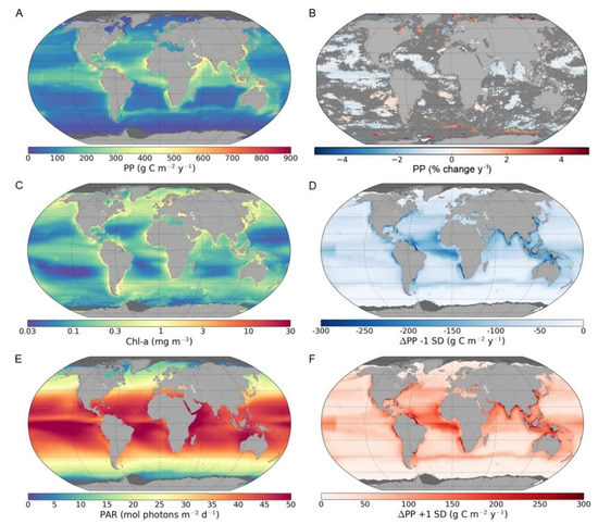 Maps of global annual primary production (PP) and associated parameters for the period of 1998–2018: (A) global annual primary production based on mean photosynthesis versus irradiance (P-I) parameters; (B) linear trends in global annual primary production between 1998 and 2018 given as percentage change per year (dark grey colour represents non-significant trends); (C) remote-sensing-derived mean surface chlorophyll-a (Chl-a); (D) difference in primary production between mean P-I parameters and –1 standard deviation (–1 SD)-based estimations; (E) remote-sensing-derived Photosynthetic Active Radiation (PAR, 400–700 nm); and (F) difference in primary production between mean P-I parameters and +1 standard deviation (+1 SD)-based estimations.