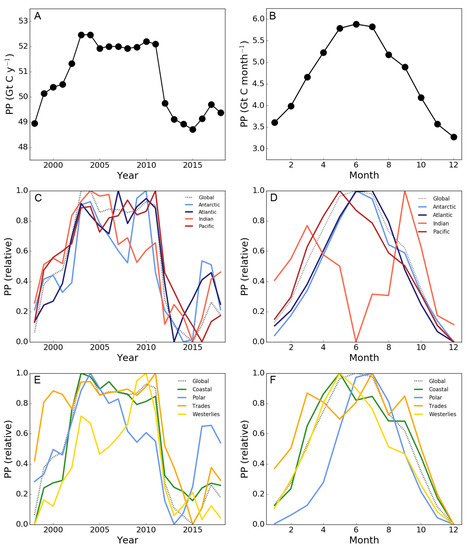 Trends in primary production (PP) with (A) annual global primary production for each year in the period between 1998 and 2018, (B) mean monthly primary production, (C) relative annual and (D) monthly primary production for each oceanic basin and (E) relative annual and (F) monthly primary production for each biome as defined by Longhurst (2007). The dotted lines illustrate the relative global primary production per year (C,E) and month (D,F). Estimates of monthly primary production for the Southern Hemisphere were shifted to depict the summer season (December–February) along with that of the Northern Hemisphere (June–August) in months 6–8. Relative trends for each basin and biome were calculated by subtracting the minimum primary production from the annual (C,E) or monthly (D,F) primary production and dividing this by the difference between the minimum and maximum primary production between 1998 and 2018 or between January and December.