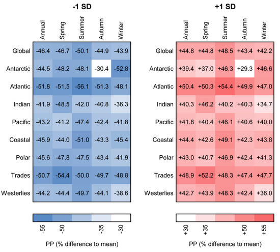 On a seasonal basis, global primary production changed between −50.1 to −43.9% and +42.2 to +48.5% when the photosynthetic parameters were adjusted by −1 and +1 standard deviation, respectively (Figure 5). The highest deviation from the mean P-I-based primary production estimates was observed during summer in the Atlantic Ocean and during spring in the Trades biome, whereas the lowest deviation was observed during autumn in the Antarctic Ocean and during winter in the Westerlies biome. Trends in seasonal primary production were similar to those observed for the mean photosynthetic parameters estimates (Figure 4) when the photosynthetic parameters were adjusted by +1 standard deviation (data not shown). When the photosynthetic parameters were adjusted by −1 standard deviation, seasonal trends changed in the Indian Ocean and the Coastal and Trades biomes. Primary production in these regions became relatively lower in spring and summer compared with other seasons (data not shown). No changes in seasonal primary production trends were observed in the Antarctic, Atlantic and Pacific oceans and the Polar and Westerlies biomes when photosynthetic parameters were adjusted by −1 standard deviation.