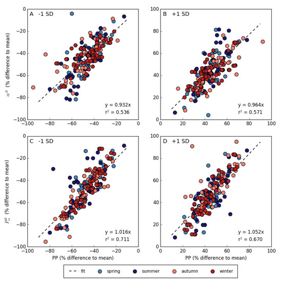 Relationship between photosynthesis versus irradiance (P-I) parameters and primary production (PP) expressed as percentage difference in (A,B) the initial slope () and (C,D) the assimilation number () of the P-I curve and primary production for –1 standard deviation (–1 SD) (A,C) and +1 standard deviation (+1 SD) (B,D) compared with mean P-I parameters estimates. Each point represents a biogeographical province and season for the period between 1998 and 2018.