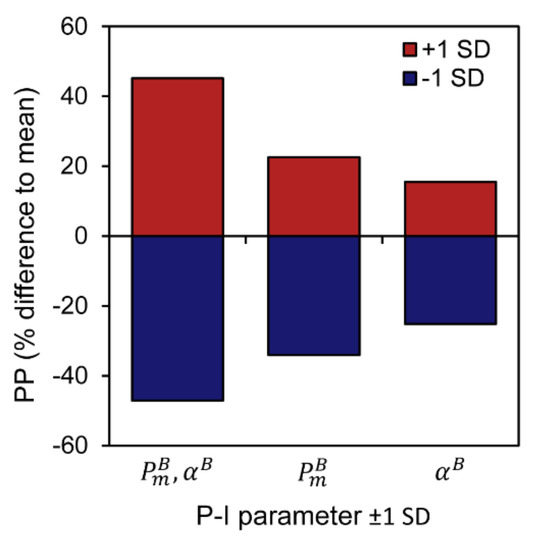 Percentage change in global annual primary production (PP) compared with estimates based on mean photosynthesis versus irradiance (P-I) parameters. Results from three different sensitivity analyses are given: (1) both the initial slope () and assimilation number () of the P-I curve were adjusted by ±1 standard deviation (SD) []; (2) only was adjusted by ±1 standard deviation []; and (3) only was adjusted by ±1 standard deviation [].