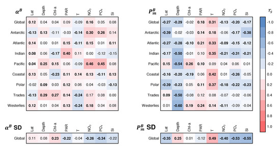 Spearman’s rank correlation coefficients () for relationships between the mean and standard deviation (SD) of the initial slope () and the assimilation number () of the photosynthesis versus irradiance (P-I) curve and environmental variables available in the P-I database, including absolute latitude (Lat), depth, chlorophyll-a (Chl-a), daily Photosynthetic Active Radiation (PAR), temperature (T), nitrate (NO), phosphate (PO) and silicate (Si). Significant relationships (p < 0.05) are given in bold.