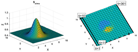 We generate sample points from a given mathematical reference surface . This latter is assumed to correspond to the probability density function of a two-dimensional normal distribution with a mean of , states for transpose and VCM of . The choice of the reference surface is justified to avoid oscillations of the approximation due to sharp edges or variations [46]. The x- and y-co-ordinates are considered to be uniformly sampled with a resolution of 0.5 in the interval . The corresponding surface is shown in Figure 1 left.