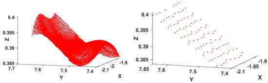 Starting from , we, furthermore, make use of the error propagation law to compute the VCM of the transformed Cartesian observations, that is, . This step is justified by the need to use Cartesian observations to compute the B-spline surface (Section 2). The same two range variances are used to scale the Identity matrix of case (i) for the sake of comparison between models. In these simulations and in the following case study, we will assume the range variance to be known; rough estimations of the range variance are available in real cases using the intensity model or manufacturer’s specifications.