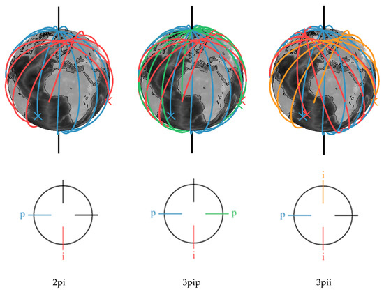 Constellations of in-line satellite pairs. (2pi) Bender double-pair, (3pip) triple-pair with additional polar pair, (3pii) triple-pair with additional inclined pair.