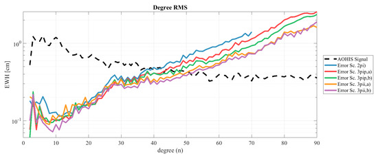 In this section, we compare the achievable performance of double pair and triple-pair scenarios. Figure 3 shows degree RMS curves for the double pair (estimated up to d/o 70) and the triple-pair (estimated up to d/o 90) scenarios as defined in Table 2 in terms of an average of the seven-day solutions of the two-monthly observation period. Daily spherical harmonic coefficients (Wiese parameters) up to d/o 15 were co-estimated, as recommended by [28]. The double pair scenarios 2pi in blue is shown as a reference. The triple-pair scenarios 3pip with the third pair being in a polar orbit (red and green) exhibited small improvements, especially in the lower degrees. Additionally, the crossover between signal and errors degree RMS curves was approximately 5 degrees higher than for the reference double pair scenario. The best performance is visible for scenario 3pii,b with the third pair in an inclined orbit and also laser instrumentation for the SST (lilac curve). With this constellation, the performance in terms of spatial resolution can be improved by 10 degrees compared to the double pair.