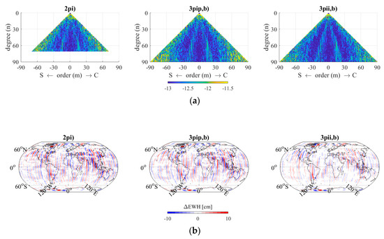 Double- vs. triple-pair scenarios (solution from 08/01/2002 to 14/01/2002). (a) Coefficient differences of scenario 2pi (computed up to d/o 70), 3pip, and 3pii (computed up to d/o 90) with all sensors set to the NGGM noise. (b) Spatial representation in terms of equivalent water heights (EWH) differences to the true solution up to d/o 50.