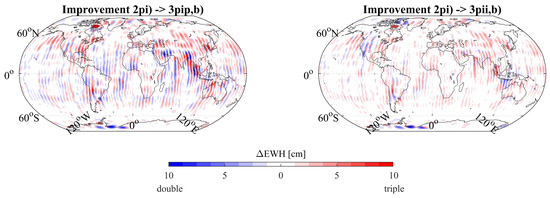 Spatial representations of the improvements of the triple pairs compared to the double pair solution are shown in Figure 5, which depicts the difference of the estimated to the reference solution of the best solution. For this, we analyzed an EWH difference grid up to d/o 50 for a seven-day solution and computed the difference of the estimated and reference field for every point of the grid. Blue means the double pair scenario 2pi had the smaller difference value, thus was closer to the reference and visualized in the figure, while red means the respective triple-pair scenario 3pip,b or 3pii,b had the smaller difference value and was closer to the truth and visualized. When comparing scenario 3pip,b with the double pair (Figure 5a), a clear improvement of the triple-pair scenario was not apparent. While in Canada, the triple pair had a lower difference value, the double pair performed better over Antarctica. Overall, the triple pair had lower difference values in the Northern hemisphere, while in the Southern part, an ambiguous picture was visible.