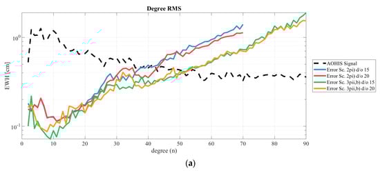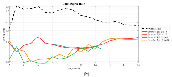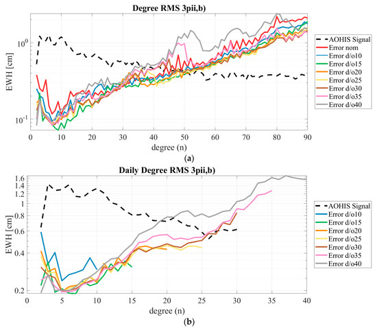 As indicated, the most significant advantage of an additional pair is the expected improved performance of the daily solution. We chose the best-performing triple-pair scenario 3pii,b as the test scenario. The maximum daily degree and order varied between d/o 10 and d/o 40 with a step size of 5. Figure 8a shows the degree RMS of the overall solution, and Figure 8b shows the daily solution. In the overall solution, the nominal processing (without co-estimating daily gravity field parameters) is also included in red. When assessing the results of the daily solutions, the lowest daily d/o as well as the highest d/o are not recommended. When computing daily solution up to d/o 10, the result in Figure 8b shows clearly that the solution was under-parametrized and performed worst in the lower degrees. The daily solution up to d/o 20 performed best in the overall solution and should be preferred if the quality of the long-term solution has the highest priority. With a crossing point of the signal and error curve at approximately d/o 26, we recommend a daily parametrization up to d/o 25 or 30. The cumulative errors in Table 5 (without omission error) and Table 6 (including omission errors) confirm that the best solutions with the highest d/o are solutions 25 to 35, as they have the lowest error values at the investigated degrees (values marked with “1”). In Table 5, we used the AOHIS signal up to the respective SH degree of the solution as a reference, while the full AOHIS signal up to d/o 40 was used for the results shown in Table 6. Therefore, the first case provides only the commissioning error of the solutions, while the latter case includes also unresolved signals (omission error). The cumulative error of the daily solution estimated up to d/o 40 has the worst performance starting at d/o 25 (values marked with “2”). Considering the processing time, which increases with higher daily parametrization, and the performance of the daily solutions, the maximum daily d/o resolution should be chosen using the crossing point of the signal and error curves as a guideline.