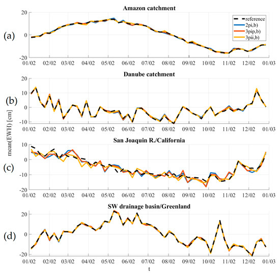Time series for four selected catchments in EWH (cm) (a) Amazon basin, (b) Danube basin, (c) San Joaquin River/California, (d) South-East drainage basin/Greenland extracted from seven-day solutions up to d/o 50 based on scenario 2pi, 3pip,b, and 3pii,b. Compare to Table 7. Daily Wiese solution co-parametrized up to d/o 15.
