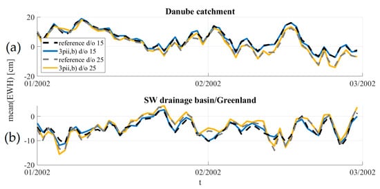 Time series in EWH (cm) for Danube catchment (a) and SW drainage basin in Greenland (b) of Scenario 3pii,b extracted from daily solutions with d/o 15 and 25. Two-month period extracted from the one year processed.