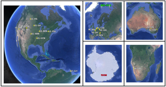- Baldocchi, D.; Falge, E.; Gu, L.; Olson, R.; Hollinger, D.; Running, S.; Anthoni, P.; Bernhofer, C.; Davis, K.; Evans, R.; et al. FLUXNET: A new tool to study the temporal and spatial variability of ecosystem-scale carbon dioxide, water vapor, and energy flux densities. Bull. Am. Meteorol. Soc. BAMS 2001, 82, 2415–2434. [Google Scholar] [CrossRef]
