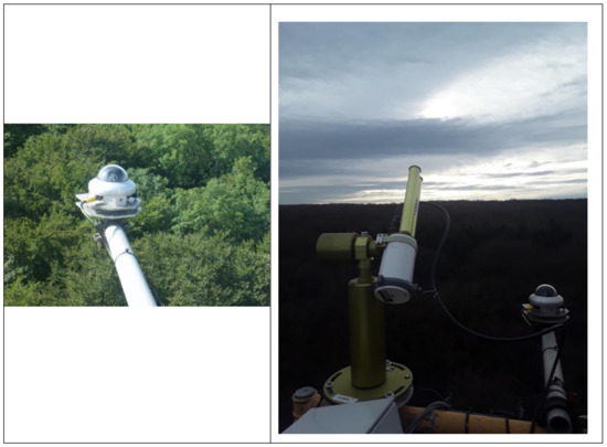 Photos taken at the Hainich FLUXNET tower site, and configuration of the albedometer (and AErosol RObotic NETwork (AERONET) CIMEL sun photometer. Courtesy of Frank Tindemann (left) and Lukas Siebicke (right), Universität Göttingen.