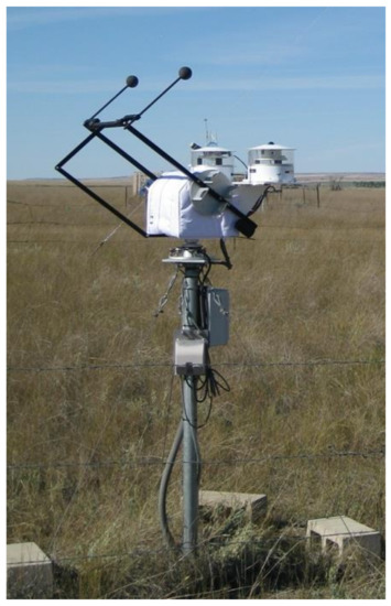 Satellite observations provide a unique tool for monitoring surface albedo on a global scale. To retrieve surface albedo from satellite-based instruments, sufficient numbers of directional surface reflectance measurements are needed in order to model the bidirectional reflectance distribution function (BRDF). Such directional measurements of surface reflectance can be obtained from a single field of view sensor by accumulating sequential measurements over a period of time (e.g., moderate resolution imaging spectroradiometer (MODIS) over 16 days), or from multi-angular sensors by directly obtaining directional measurements near simultaneously (e.g., multi-angle imaging spectroradiometer (MISR) within 7 minutes). Over the last two decades, global land surface albedo products have been generated from various satellite-based instruments, including MODIS [3], MISR [4], Advanced Very High Resolution Radiometer (AVHRR) [5], and more [6,7]. Surface albedo retrieved from satellite observations are frequently contaminated by noise from atmospheric corrections to convert top-of-atmosphere (TOA) reflectances to surface reflectances, using narrow-to-broadband conversions to transform spectral albedo to broadband albedo, as well as using insufficient multi-angular measurements in BRDF modelling. In addition, there are many instances of residual cloud contamination effects [8]. In situ tower albedometers, which can provide “ground truth” of surface albedo over a field-of-view (FoV) from tens to a few hundred metres, are therefore often used to validate satellite retrieved coarse-resolution albedo products. Typical albedometers consist of two calibrated pyranometers, with one measuring downwelling solar radiation and the other measuring surface reflected upwelling radiation. The Baseline Surface Radiation Network (BSRN) was designated as the global baseline network for surface radiation for the World Meteorological Organization (WMO) and World Climate Research Programme (WCRP), and started providing systematic albedometer observations since 1992 from 10-m high towers [9]. The surface radiation budget network (SURFRAD), which is also a contributor to the BSRN, has maintained an excellent record of solar radiation at tower stations in the US since 1995 [10]. FLUXNET [11] is also a global network of micrometeorological tower sites, but focused mainly on measurements of carbon dioxide and water fluxes. Many of these FLUXNET sites include tower-based albedometers covering a wide range of different land cover types including forests, croplands, grasslands, wetlands, etc. (fluxnet.ornl.gov).