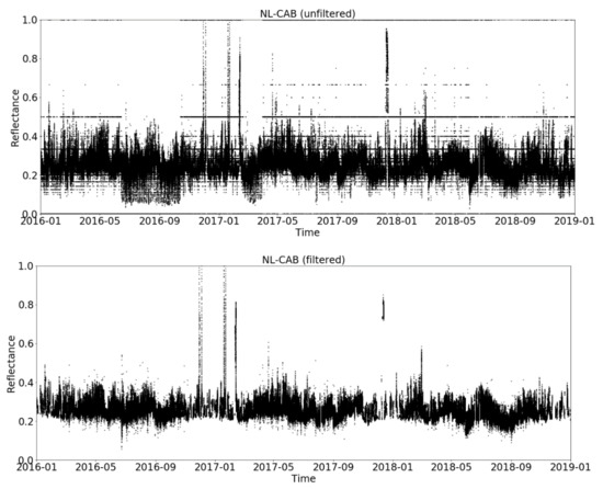 Comparison of unfiltered and filtered reflectance variations at the NL-CAB sites between the years 2016 and 2018.
