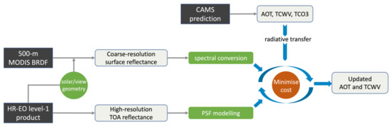 - An inverse problem is built to solve the aerosol optical thickness (AOT), total columnar water vapour (TCWV) and total columnar ozone (TCO3) based on a prior distribution from CAMS. This step also includes a spatial regularisation that smooths the spatial variation of atmospheric composition.