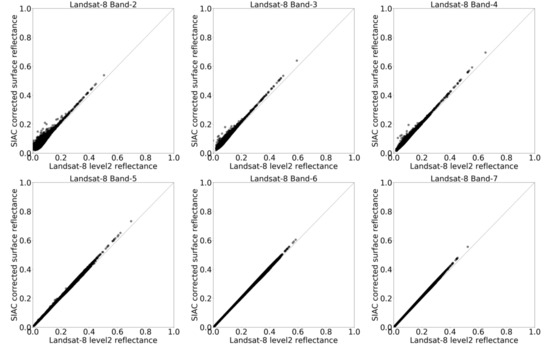 To illustrate the performance of SIAC atmospheric corrections, six 2D scatterplots are shown in Figure 7 to illustrate an intercomparison of Landsat-8 spectral surface reflectance derived from SIAC corrections and that derived from the LaSRC algorithm (https://github.com/USGS-EROS/espa-surface-reflectance/tree/master/lasrc). LaSRC is the specialized software that is used to produce Landsat-8 level-2 surface reflectance products. Surface reflectance derived from SIAC corrections display a good correlation with LaSRC corrections, except for a small bias at higher reflectance values. At low-reflectance values in bands 2, 3 and 4 (see Figure 7 caption for wavelengths), SIAC and LaSRC retrievals have larger uncertainties due to higher uncertainties arising from greater scattering.