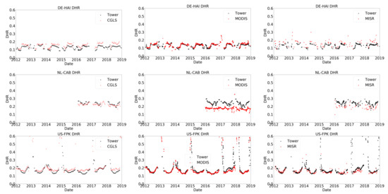 Intercomparison of DHR values derived from in situ tower measurements and coarse-resolution satellite products at the DE-HAI, NL-CAB and US-FPK sites. Copernicus Global Land Service (CGLS) values are depicted in the first column, moderate resolution imaging spectroradiometer (MODIS) values are depicted in the second column and multi-angle imaging spectroradiometer (MISR) values are depicted in the third column.