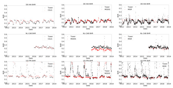 Intercomparison of BHR values derived from in situ tower measurements and coarse-resolution satellite products at the DE-HAI, NL-CAB and US-FPK sites. CGLS values are depicted in the first column, MODIS values are depicted in the second column and MISR values are depicted in the third column.