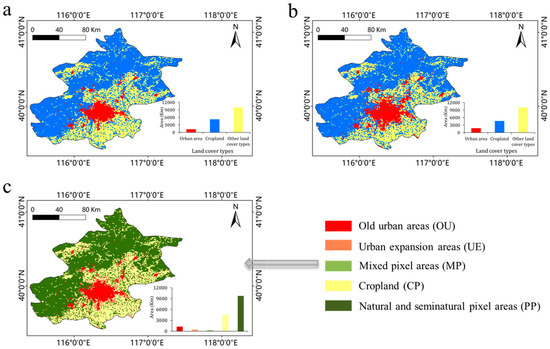 In general, at the kilometer level (or 500 m in this study), mixed pixels always exist. Given that urban area occupies a large proportion in Beijing, the atmospheric conditions in urban, suburban, and neighboring rural areas are all impacted by human activities [20,60]. Furthermore, the areas of anthropogenic impacts on vegetation and albedo are much larger than the urban boundary itself [19,55,57,61]. The impacts of human activities, such as urbanization, are often reflected on a larger scale. A regional climate model can simulate the climatic effects of the underlying surface changes at a mesoscale resolution [24,62]. Some scholars have used the relatively coarse-resolution remote sensing data (0.5° resolution) to study the effects of human influence on vegetation phenology and production, as well [19,20], but the land cover changes within a pixel cannot be checked.