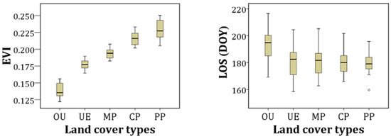 This study compared the differences of EVI and LOS among various land cover types. Figure 4 shows that the EVI had a decreasing trend with the degree of human activity. PP had the largest EVI and the average value from 2000 to 2015 was 0.229; followed by CP, with an average EVI of 0.216. However, the EVIs in OU, UE, and MP with a relatively dense population and a large influence were all relatively small, with averages of 0.139, 0.177, and 0.194, respectively. In contrast, the average value of LOS generally exhibited a decreasing trend with the degree of human activity in the five land cover types, namely OU > UE > MP > CP > PP. Figure 4 also showed that the LOS in OU was the longest, which implies that LOS is clearly affected by human activities.