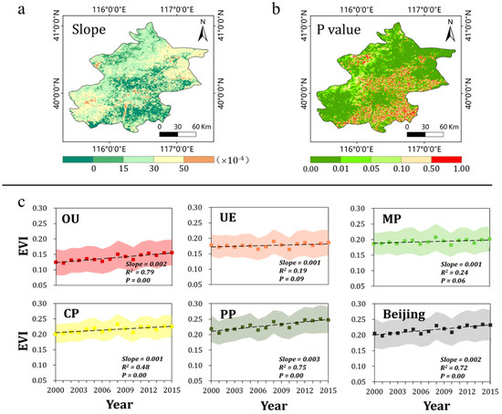 Spatial pattern and temporal changes of enhanced vegetation index (EVI) in Beijing. a and b are the spatial patterns of annual trend and significant test (P value); c is the annual change with standard deviation (shadow zones with different colors) of various land cover types for EVI from 2000 to 2015.