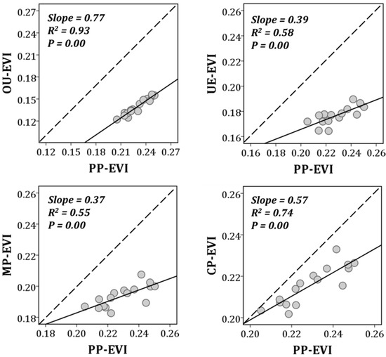Relationship between pure pixels (PP) and other four land cover types for enhanced vegetation index (EVI).