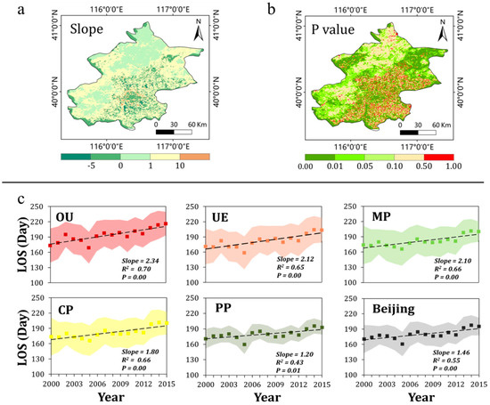 To measure the impact of human activities on the growth process of vegetation, this study used the LOS for comparative analysis. From 2000 to 2015, the overall LOS of Beijing showed a significant increasing trend, with an overall growth rate of 1.46. The LOS in UE, MP, and CP showed a large and significant increasing trend of 2.12, 2.10, and 1.80, respectively. Although the LOS in PP also showed a significant increasing trend, the rate was the smallest (Figure 7).