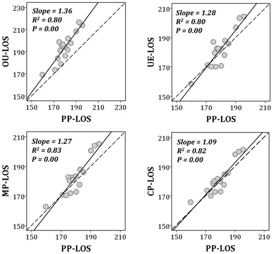 Assuming that the change of LOS in PP corresponds to the change rate under natural conditions, the natural change rate of LOS in Beijing was 1.20. The differences of LOS between the change rate of the other four land cover types and PP were calculated. The residual change rates of OU, UE, MP, and CP were 1.14, 0.92, 0.90, and 0.60. All regression coefficients of the LOS in the four land cover types impacted by human activities were greater than 1 (Figure 8). The analysis results for LOS were clearly the opposite to the results for EVI, showing that human activities have a positive effect on the LOS (increasing the LOS) and the effect increases along with the impact intensity of human activities.