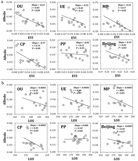 Factors such as vegetation greenness and growth length directly affect the surface albedo, which in turn affects radiative forcing. In this study, we analyzed the relationship between the albedo, EVI and LOS in Beijing, finding a significant negative correlation between the albedo and EVI, and the LOS (Figure 9). Except for the UE and PP, the negative correlations between the albedo and EVI were all significant in the other three land cover types (P < 0.05). Among the five land cover types, the albedo of MP decreased most rapidly with the increase of EVI. In contrast, the absolute value of the linear slope in PP was the smallest, at −0.02. This indicates that EVI in the natural PP does not have a significant impact on the albedo. In terms of LOS, apart from in PP, the albedo and LOS showed a negative correlation in the other four land cover types, and the significance gradually increased in CP, UE, MP, and OU (P-value tended towards 0). The linear slopes of the LOS and albedo in the five land cover types were all very small compared with the EVI and albedo. The absolute values of the linear slope in UE, MP, and CP were the largest; however, the averaged value was only −0.0002. The absolute values of the linear slope in OU was smallest than that in UE, MP, and CP; however, the slope value in PP was very close to 0. These indicate that the extension of the vegetation growth length has little effect on the surface albedo for natural vegetation, while the extension of LOS reduced the surface albedo under the influence of human activities. Overall, in the four land cover types under human influence, both EVI and LOS had a negative correlation with the albedo, indicating that human activities have contributed to the changes of albedo by affecting the EVI and LOS.