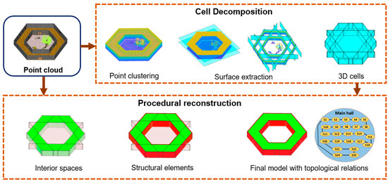 As shown in Figure 1, the proposed approach contains two main steps: space decomposition and procedural reconstruction. In the first step, the potential planar-surfaces of structural elements (e.g., wall surfaces) are extracted from clustered points of the point cloud, and the surfaces are then used to decompose the indoor environment into a set of 3D cells. Intuitively, building surfaces usually separate different interior elements (e.g., between spaces and walls). Thus, different types of interior elements (e.g., spaces and walls) are likely to be represented as separated cells. The point cloud and the 3D cells are then used in the reconstruction process.
