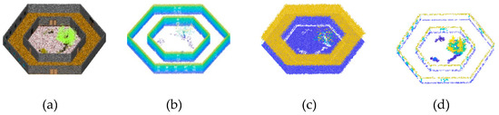 Point clustering: (a) an input point cloud of a hexagonal building; (b) vertical points; (c) horizontal points; and (d) other points (e.g., clutter and noise).
