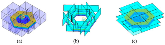 Local-scale surface extraction: (a) voxelized structure of the input point cloud; (b) extracted vertical surfaces; and (c) extracted horizontal surfaces.
