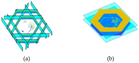 Given that point clouds captured by various lidar sensors normally have an upright orientation, a point is classified as horizontal or vertical if its normal is parallel with the horizontal direction and vertical direction , respectively, up to a small deviation (e.g., degrees). The points which belong to neither horizontal nor vertical groups are classified as others, and these points are then excluded in further processes. Figure 2 shows an example of point clustering, which demonstrates the exclusion of a considerable amount of clutter from the points representing building structures (i.e., vertical and horizontal points) of a hexagonal building.
