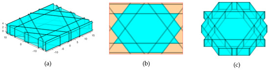 Cell decomposition: An arrangement of the extracted horizontal and vertical surfaces decomposes the building interior into a set of 3D cells. The intersections between all vertical surfaces with a horizontal structure, such as the floor surface of the building, are first computed. These line intersections are then used to partition the horizontal structure into a set of 2D cells using the 2D arrangement [38] of the Computational Geometry Algorithms Libraries [39]. These horizontal 2D cells are then extruded in vertical directions and intersected with the other horizontal surfaces (e.g., the ceiling) to generate 3D cell decomposition of the building interior. Figure 5 illustrates the cell decomposition of the hexagonal building from its vertical and horizontal surfaces.