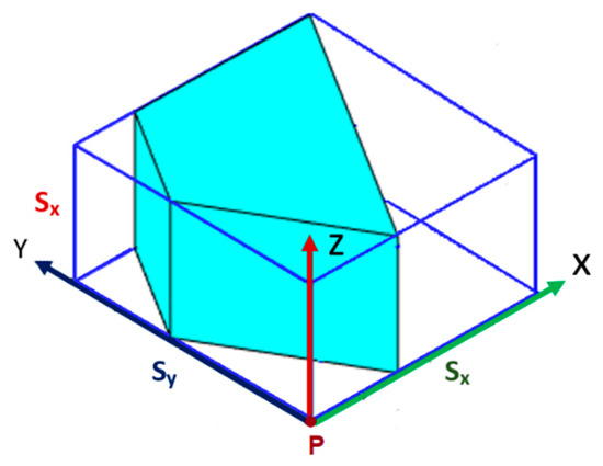 Similar to that in Reference [11], the semantic attribute implies the type of a shape, which can take one of three values (interior space, exterior, and wall), and the topological attributes indicate the shape’s adjacency, connectivity, and containment relations. The starting shape is a unit scope with the point P located at the origin of the local coordinate system, and the unit scale represents the dimensions along the x-, y-, and z-axes. The unit scope has empty geometry, no semantic information, and topological relations.