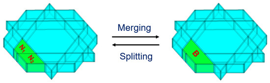 The adjacency rule establishes the adjacency relation between two nonterminal shapes and . Prior to the reconstruction of structural elements, the two nonterminal shapes are adjacent on the condition that they share a common face. After the modelling of structural elements, two final interior spaces are in an adjacency relation if there is a common wall between them.