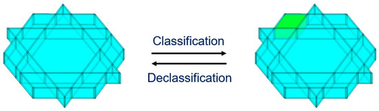 The declassification rule is a reversible process of the classification rule. The rule nulls the type attribute of a nonterminal shape N. Similar to the classification rule, the condition cond and the probability prob can be automatically learned during the reconstruction of interior spaces (detailed in Section 4).