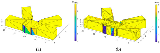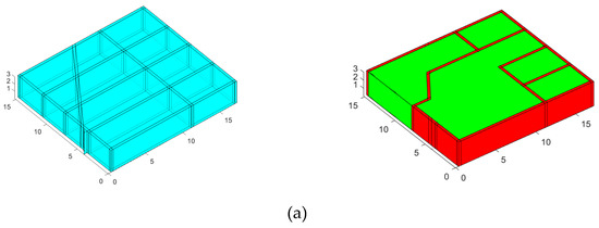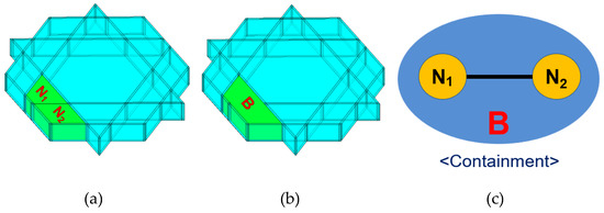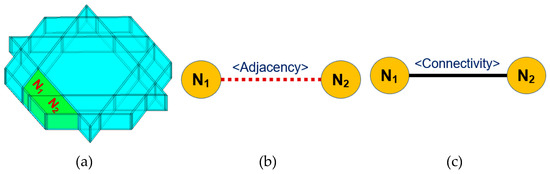Figure 9 shows the topological adjacency and connectivity relations established between the shapes and , which are two interior spaces of an indoor environment (Figure 9a). The adjacency relation (Figure 9b) of the shapes and is established due to a shared common face between them, and the connectivity relation (Figure 9c) is established since there is no actual physical surface between them.