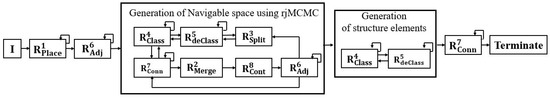 The reconstruction of the building interior then proceeds with a search for an optimal configuration of interior spaces (i.e., rooms and corridors) in the model . In this step, we aim at maximizing the model fitness to the input point cloud , while maintaining the model plausibility and its simplicity. In other words, we search for the most probable model given the data ) based on a stochastic approach using rjMCMC sampling with the Metropolis–Hastings algorithm [16,41]. The rjMCMC algorithm simulates random walks from the current model to the next proposed configuration with a capacity to cope with the variability of the number of shapes in each model configuration. The transition from a current state to the following configuration is decided by both the model probability ), a transition probability , and an acceptance probability as defined in Equation (10). The description of the model probability and the transition kernel are detailed in the following sections.