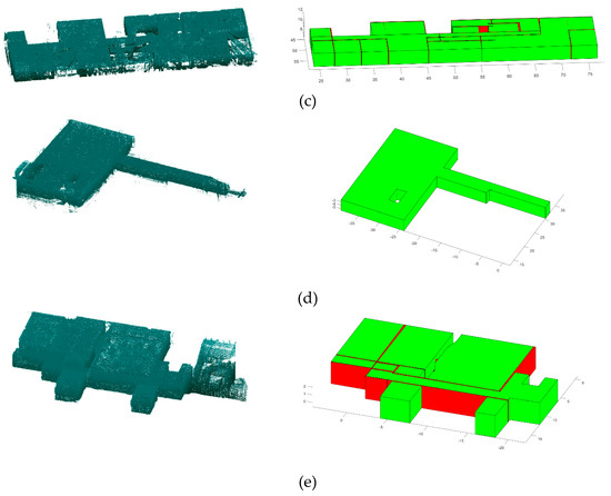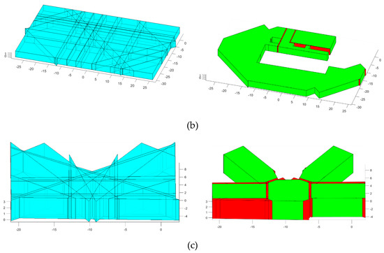 Reconstructed models, including the models’ 3D cell decomposition (left) and the final models (right): (a) SYN; (b) Office; and (c) Museum. Green surfaces represent interior spaces (i.e., rooms and corridors), and red surfaces represent volumetric walls.