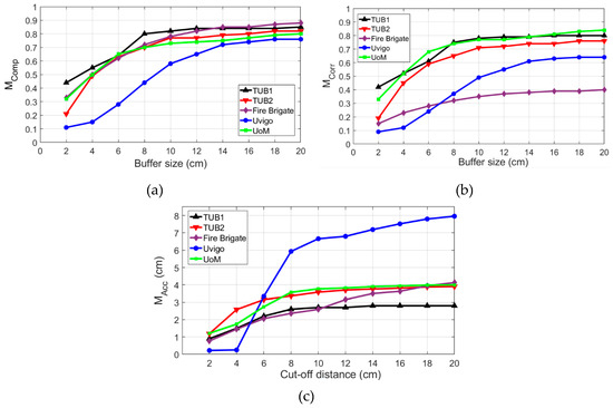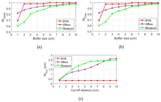 The quality of the reconstructed models is measured in terms of three quality metrics, i.e., completeness (Mcomp), correctness (Mcorr), and accuracy (Macc) for the buffer size b and the cutoff distance r in the range [1 cm, 10 cm]. The completeness aspect indicates to what extent the geometric elements of the ground truth are present in the reconstructed model, while the correctness aspect expresses to what the extent the elements in the reconstructed model are present in the ground truth. These quality metrics are defined as follows [3]:
