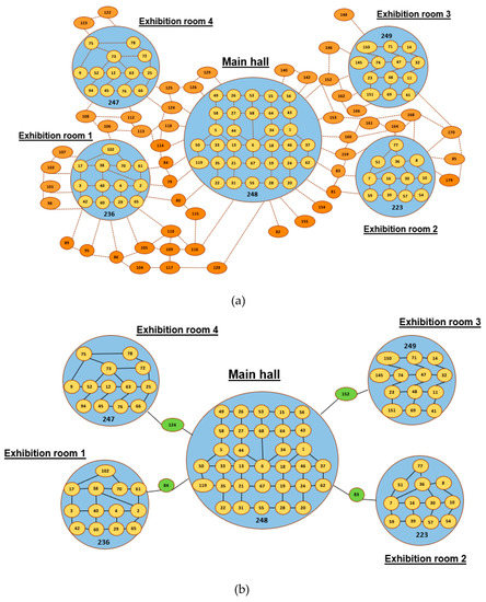 Topological graphs between interior spaces of the Museum: (a) adjacency and containment relations and (b) connectivity and containment relations.