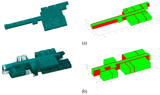 The proposed approach was also evaluated using the ISPRS indoor modelling benchmark data sets [45]. Although these data sets mostly contain Manhattan world structures, they represent large and complex indoor environments with various levels of noise, clutter, and occlusions and were acquired by different types of laser sensors, including both terrestrial (e.g., Faro Focus) and mobile (e.g., Zeb and Viametris) laser scanners.