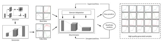 However, the labeled data are quite scarce in hyperspectral datasets, since the label collection involves expensive and time-consuming field investigation. Thus, labeled data shortage is one of the biggest challenges for the task of hyperspectral image classification. According to the Hughes effect, when the dimensionality of hyperspectral data is high, the limited number of labeled samples will result in low classification accuracy. Besides, deep learning frameworks also face the over-fitting problem when feeding with insufficient training samples. To compensate for the effects of labeled sample shortage, the semi-supervised learning and domain adaptation techniques are developed to increase the number of samples. In particular, the semi-supervised learning considers both the unlabeled samples and labeled ones to be integrated for model training. Furthermore, the domain adaptation aims to transfer existing labeled data to be used in new classification tasks. Meanwhile, some works were devoted to generating high-quality samples based on the standard spectral database by considering the correlations between spectral bands [,]. However, due to the impact of the atmosphere, bidirectional reflectance distribution function (BRDF) effect, and even the intra-class variation, it is difficult to generate realistic samples from the standard spectral library by considering such corrupted conditions when referring to physical models, such as the radiative transfer model [].