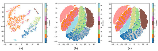 The 2D projection map based on generated samples before/after domain adaptation using SaGAAN: (a) the projection map of training samples; (b) the projection map of generated samples before domain adaptation; and (c) the projection map of generated samples after domain adaptation.