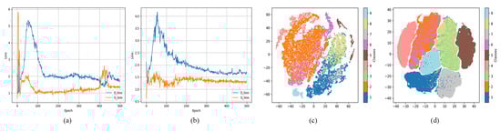 The training losses and sample 2D projection for SaGAAN with/without domain adaptation and self-attention: (a) the training loss values for SaGAAN without domain adaptation and self-attention; (b) the training loss values for SaGAAN with domain adaptation and self-attention; (c) the 2D projection of all available original hyperspectral samples; and (d) the 2D projection of generated hyperspectral samples using SaGAAN.