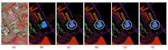 The classification maps of Pavia University dataset: (a) the original dataset; (b) the ground truth labels; (c) classification map with the original dataset; (d) classification map with domain adaptation term; (e) classification map with self-attention mechanism; and (f) classification map with SaGAAN.
