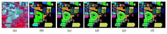 The classification maps of Indian Pines dataset: (a) the original dataset; (b) the ground truth labels; (c) classification map with the original dataset; (d) classification map with domain adaptation term; (e) classification map with self-attention mechanism; and (f) classification map with SaGAAN.